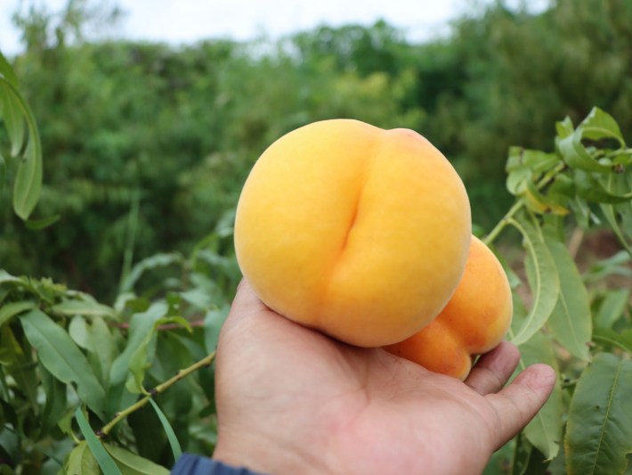 8月下旬成熟,果形端正美观,单果重270-450克,黄肉粘核,硬溶质,含糖量19%,纯甜,品质极优,套袋果面金黄色,自花授粉,极丰产。