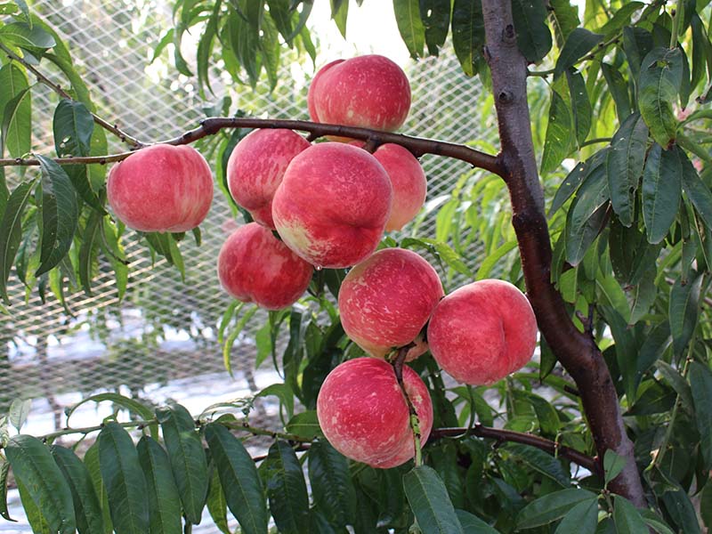 9月25日成熟,果形平顶,桃中着色条红的品种,含糖量20%,货架期40天,单果重400克,大果800克以上,自花结实,亩产6000千克以上。